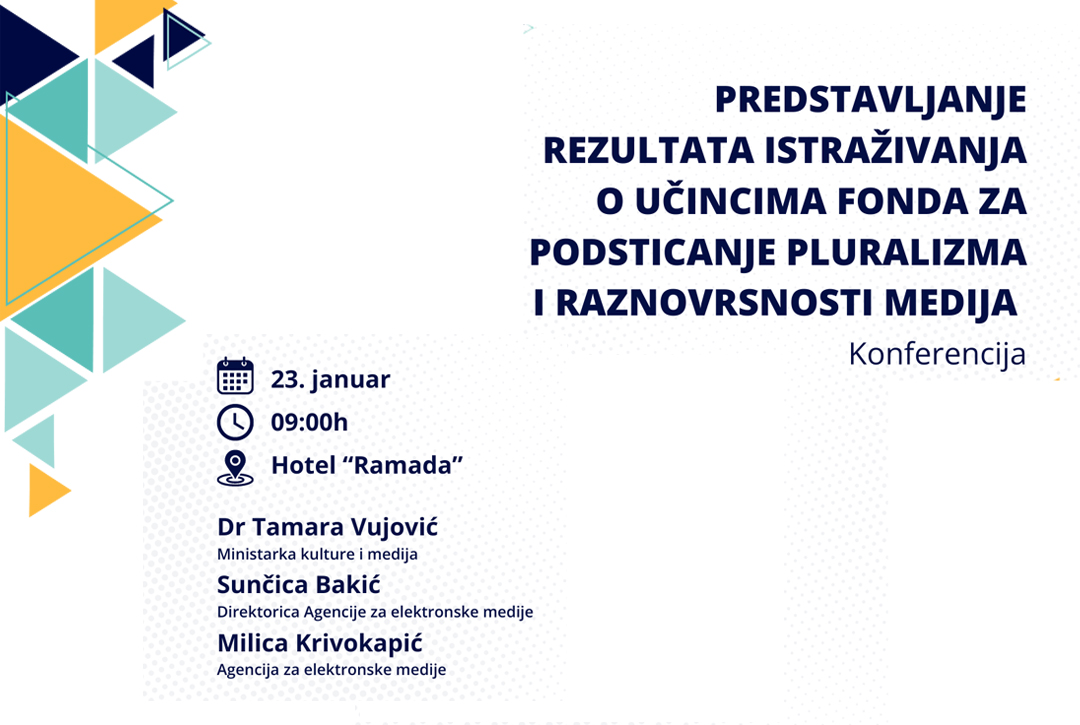 Pozivamo vas na konferenciju „Predstavljanje rezultata Istraživanja o učincima Fonda za podsticanje pluralizma i raznovrsnosti medija“, koju Agencija za elektronske medije organizuje sjutra 23. januara 2024. godine u 9 časova, u hotelu Ramada u Podgorici.